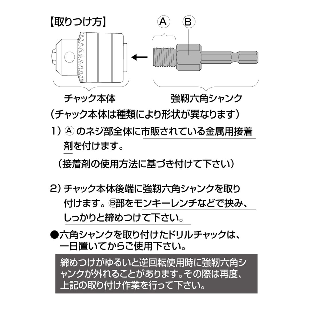 (交換例のドリルチャックはAKL-170です。他の強靭六角シャンク付ドリルチャックも同様の作業で行ってください。)