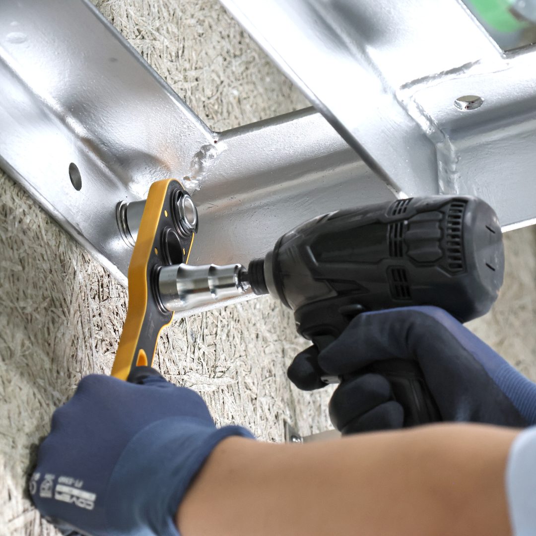 ●狭所のボルト・ナット回しの時短と省力を実現する電動ドライバー用アタッチメント工具です