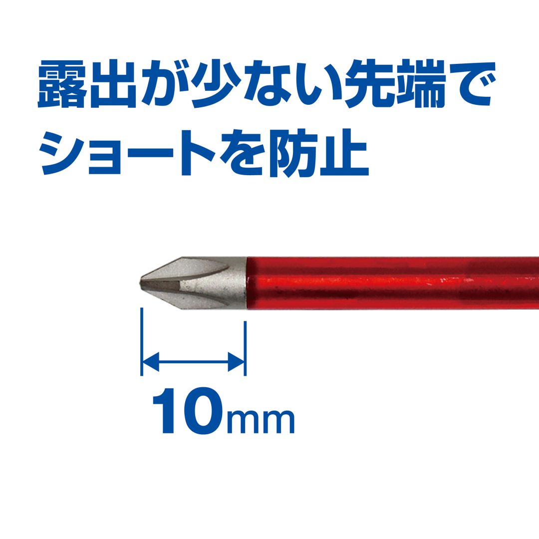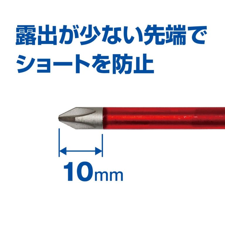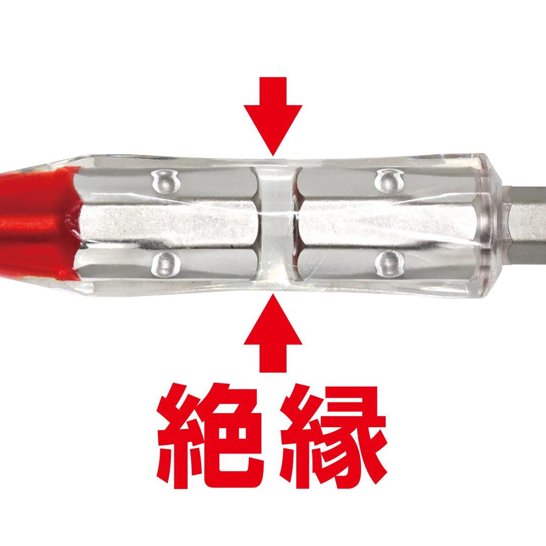 ●通電しないビット(ビット中央をプラスチックで遮断)●電気・通信設備工事などの作業に●耐電圧1000V(10000Vの絶縁耐電圧試験済)●電動ドライバー7.2V以下推奨●狭い箇所に便利なスリム先端●軸カバー色で先端サイズがわかります 赤:+1●電動工具・トルクドライバーを選ばすに使えるW溝タイプ●マグネット付