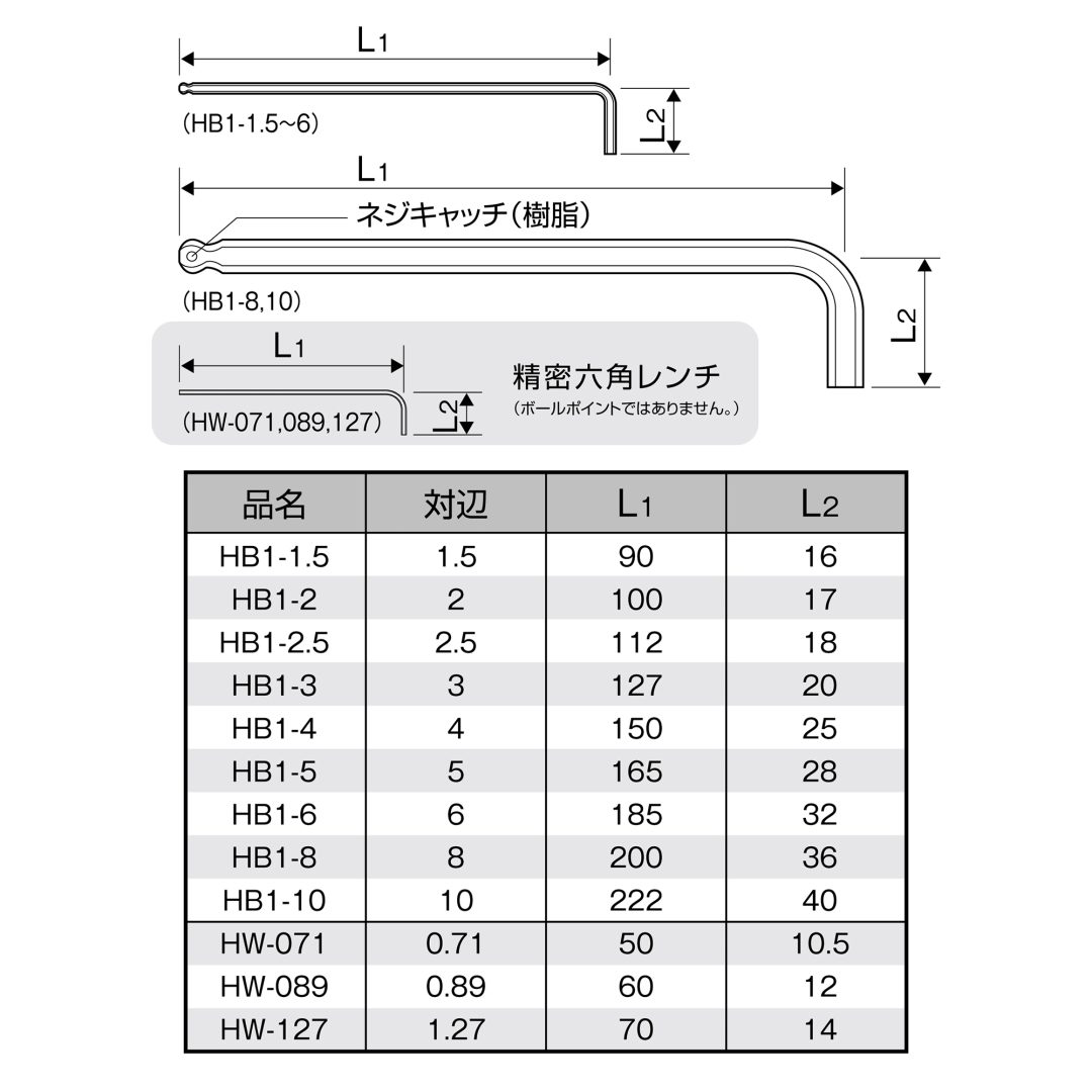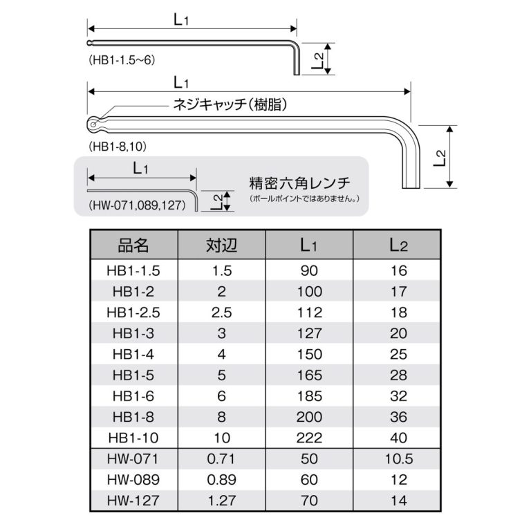 ●ネジにフィットし、傾けて滑らかに回せるボールポイント●強度・ネバリ強さ・硬さが抜群の強靭型レンチ●指先で簡単につまめるキャッチグリップ付(対辺1.5/2mm)●ネジをしっかりつかむネジキャッチ付(対辺8/10mm)●着磁・脱磁ができるマグキャッチ付